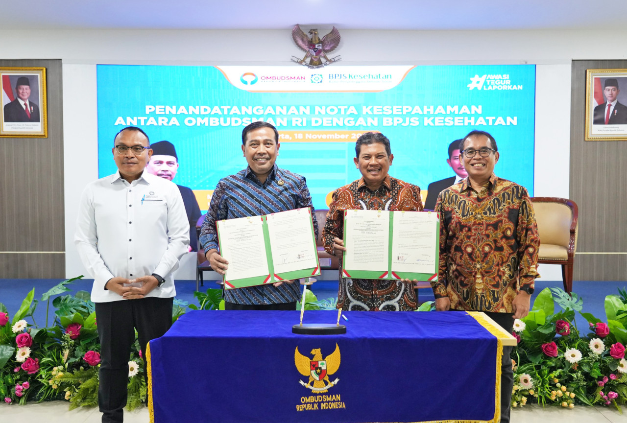 Ketua Ombudsman RI Mokhammad Najih dan Direktur Utama BPJS Kesehatan Prof. Ali Ghufron Mukti menandatangani Nota Kesepahaman (MoU) antara Ombudsman RI dan BPJS Kesehatan di Gedung Ombudsman RI, Jakarta Selatan, pada Selasa (18/11/2025). Penandatanganan Perjanjian Kerja Sama turut dilakukan oleh Anggota Ombudsman RI Robert Na Endi Jaweng dan Direktur Kepesertaan BPJS Kesehatan David Bangun.