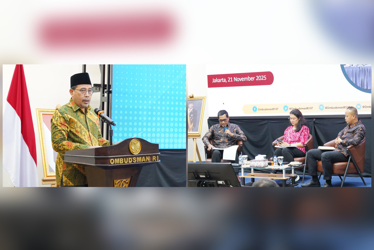 Ketua Ombudsman RI, Mokhammad Najih memberikan sambutan dalam Diskusi Publik dan Penyerahan Laporan Hasil Analisis Kajian Sistemik “Integrasi Sistem Pengawasan Perlintasan Orang Sebagai Upaya Pencegahan Tindak Pidana Perdagangan Orang” pada Jumat (21/11/2025) di Gedung Ombudsman RI, Jakarta Selatan. Turut hadir sebagai pemapar hasil kajian, Anggota Ombudsman RI Johanes Widijantoro dan Executive Director Synergy Policies, Dinna Prapto Raharja sebagai narasumber.