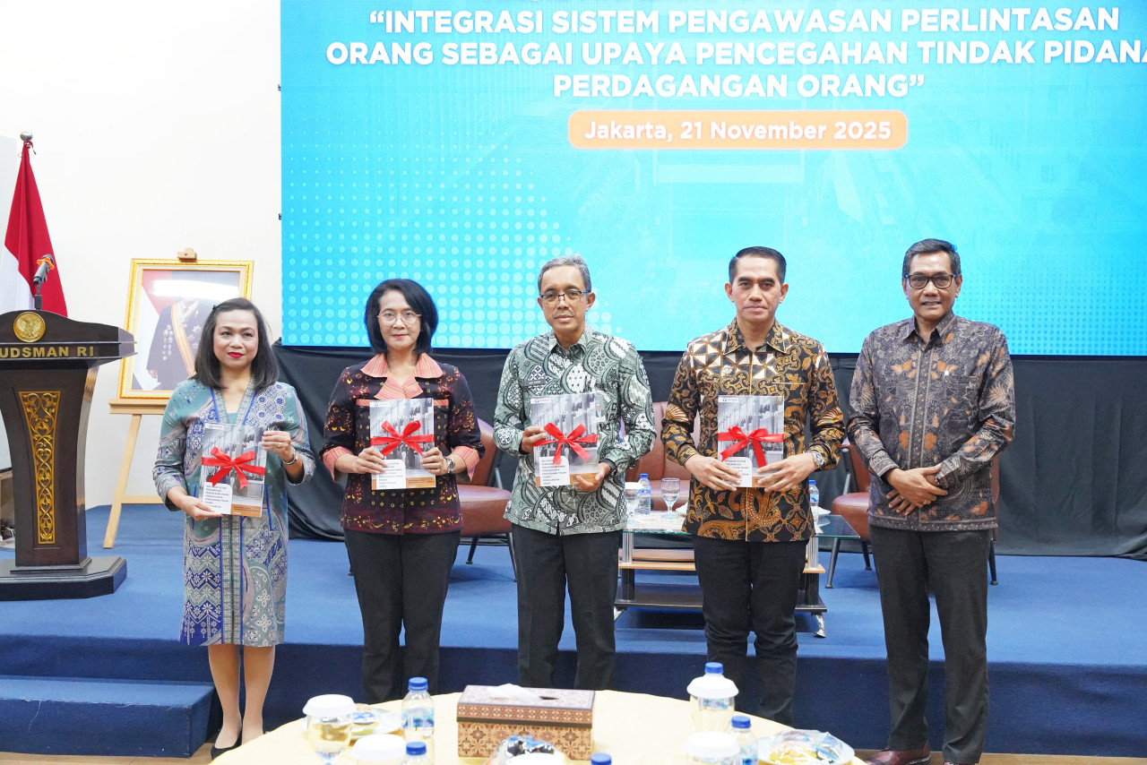 Anggota Ombudsman RI, Johanes Widijantoro menyerahkan Laporan Hasil Analisis Kajian Sistemik “Integrasi Sistem Pengawasan Perlintasan Orang Sebagai Upaya Pencegahan Tindak Pidana Perdagangan Orang” kepada Kementerian Imigrasi dan Pemasyarakatan, POLRI, Kementerian Pelindungan Pekerja Migran Indonesia, dan Kementerian Luar Negeri, pada Jumat (21/11/2025) di Gedung Ombudsman RI, Jakarta Selatan.