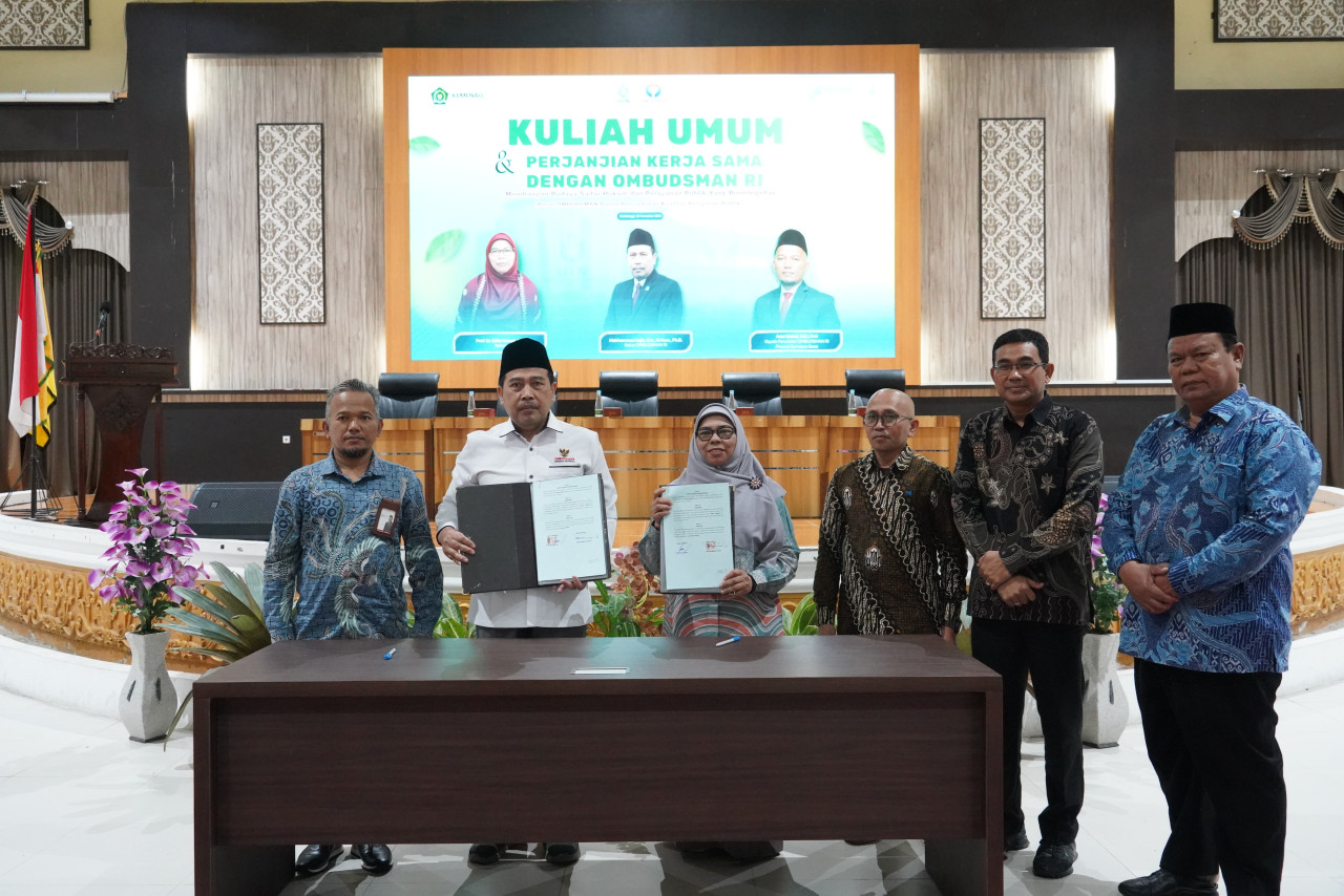 Ketua Ombudsman RI, Mokhammad Najih bersama Rektor Universitas Islam Negeri (UIN) Sjech M. Djamil Djambek Bukittinggi Prof. Silfia Hanani menandatangani nota kesepahaman antara kedua belah pihak tentang Pelaksanaan Tri Dharma Perguruan Tinggi dalam rangka peningkatan kualitas penyelenggaraan pelayanan publik pada Rabu (26/11/2025) di Bukittinggi, Sumatera Barat.