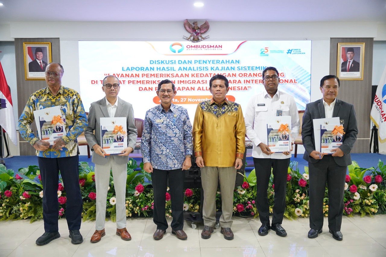 Wakil Ketua Ombudsman RI, Bobby Hamzar Rafinus di dampingi Anggota Ombudsman RI, Jemsly Hutabarat menyerahkan laporan hasil analisis kajian sistemik "Layanan Pemeriksaan Kedatangan Orang Asing di Tempat Pemeriksaan Imigrasi Bandara Internasional dan Penerapan All Indonesia” kepada Kemenko Bidang Infrastruktur dan Pembangunan Kewilayahan, Ditjen Imigrasi, Ditjen Perhubungan Udara dan PT. Angkasa Pura Indonesia. Kamis, (27/11/2025) di Gedung Ombudsman RI.