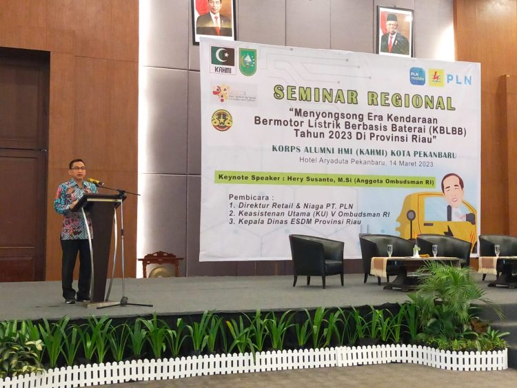 Cakrawalatoday.com - Seminar Regional dengan tema "Menyongsong Era Kendaraan Bermotor LIstrik Berbasis Baterai (KBLBB) Tahun 2023 di Provinsi Riau" yang ditaja oleh Majelis Daerah Korps Alumni Himpunan Mahasiswa Islam (KAHMI) Kota Pekanbaru pada hari ini (14/03/2023) di Hotel Aryaduta Pekanbaru, menghadirkan Anggota Ombudsman Republik Indonesia Hery Susanto yang didaulat sebagai pembicara kunci (Keynote Speaker). Hery membahas tema Pengawasan Pelayanan Publik, Regulasi dan Implementasi Kendaraan Bermotor Listrik Berbasis Baterai (KBLBB).