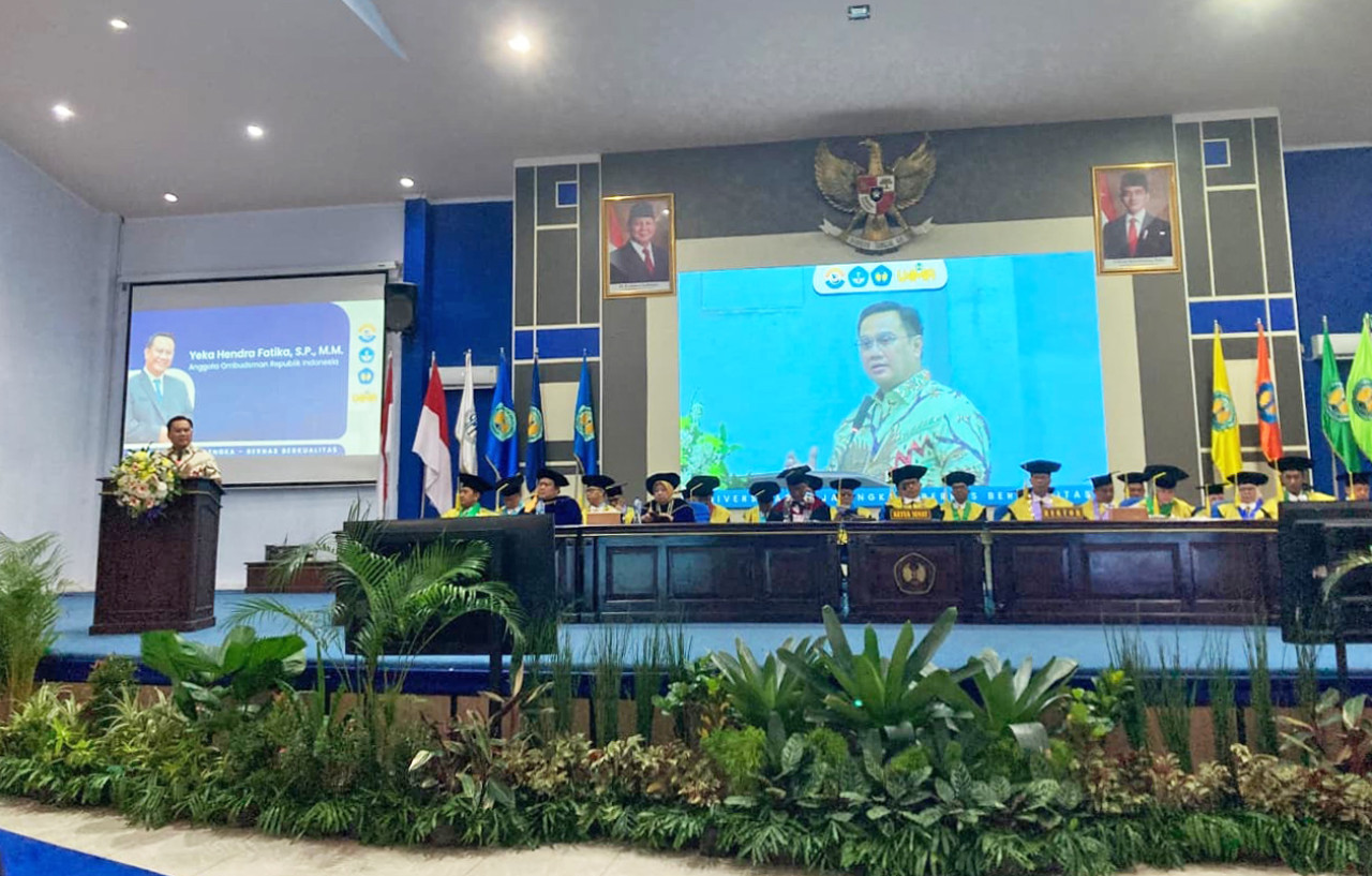 Anggota Ombudsman RI, Yeka Hendra Fatika memberikan sambutan tanggapan dalam Pengukuhan Guru Besar Ranting Ilmu/Kepakaran Pembangunan Pertanian Prof. Jaka Sulaksana, S.P., M.Si., P.Hd. dan Orasi Ilmiah "Peningkatan Efisiensi dan Keberlanjutan Usahatani Pangan dan Komoditas Unggulan Lokal Dalam Mendukung Pencapaian Sustainable Development Goals (SDG's), pada Rabu (14/1/2026) di Auditorium Universitas Majalengka.