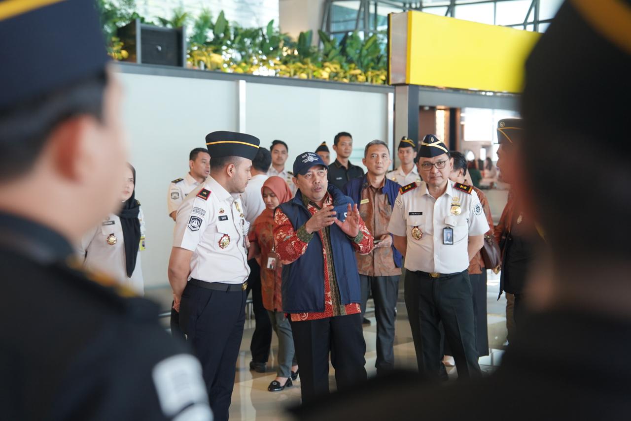 Ketua Ombudsman RI Mokhammad Najih berbicara dengan Kepala Kantor Wilayah Direktorat Jenderal Imigrasi DKI Jakarta Pamuji Raharja saat melakukan deteksi lapangan terpadu sebagai tindak lanjut pelaksanaan sistem layanan keimigrasian berbasis digital All-Indonesia di Bandara Internasional Soekarno-Hatta pada Selasa (20/1/2026).