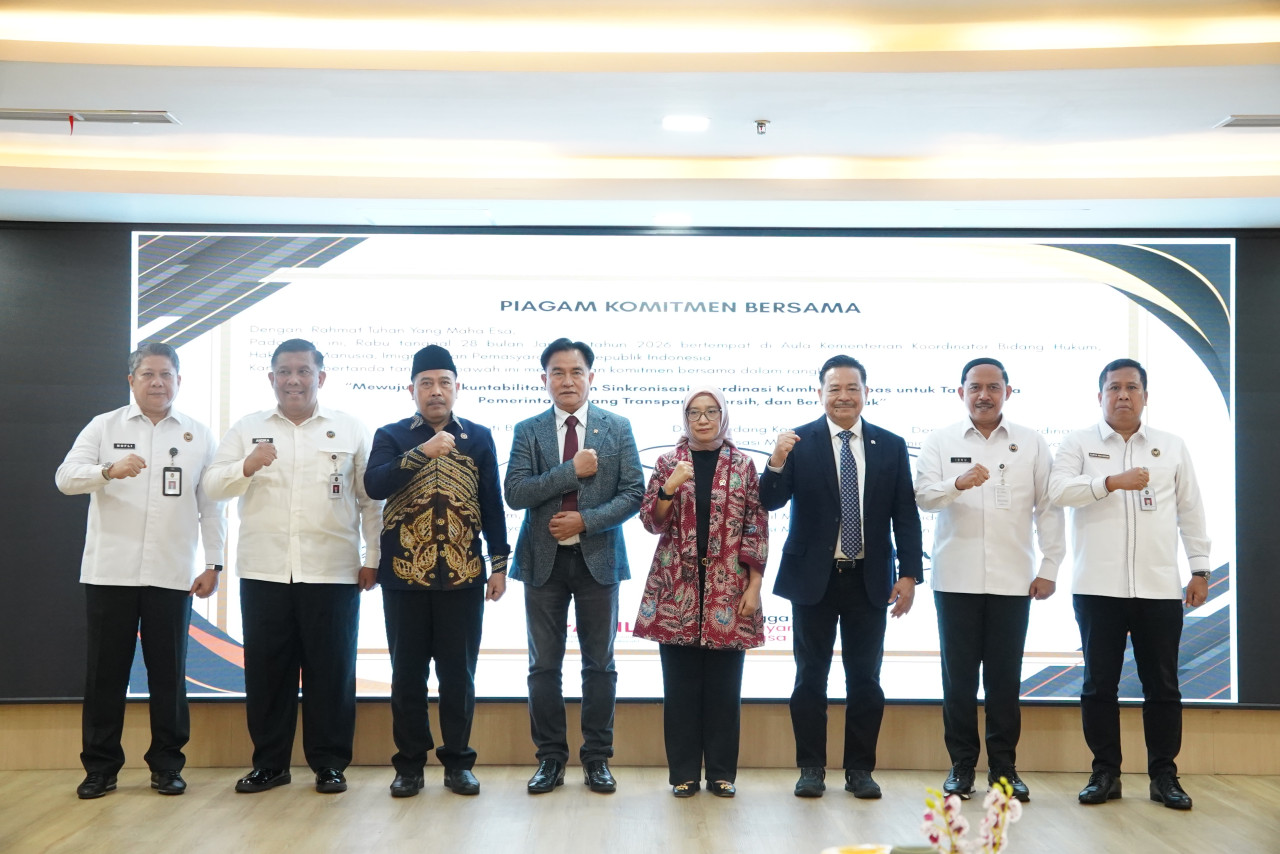 Ketua Ombudsman RI Mokhammad Najih beserta Menteri Koordinator Bidang Hukum, Hak Asasi Manusia, Imigrasi dan Pemasyarakatan Yusril Ihza Mahendra dan Menteri Pendayagunaan Aparatur Negara Reformasi Birokrasi Rini Widyantini berfoto bersama dalam Pencanangan Pembentukan ZI menuju WBM/WBBK di Kantor Kementerian Koordinator Bidang Hukum, Hak Asasi Manusia, Imigrasi dan Pemasyarakatan di Jakarta, Rabu (28/1/2026).