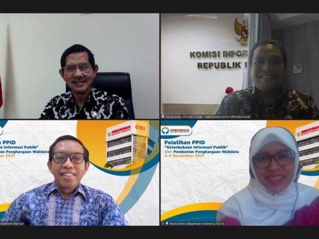 Jakarta - Dalam rangka meningkatkan kualitas pelayanan Informasi Publik sebagaimana diamanatkan oleh Undang-Undang No. 14 Tahun 2008 tentang Keterbukaan Informasi Publik, Ombudsman RI menggelar Pelatihan PPID "Keterbukaan Informasi Publik" dan Pemberian Penghargaan Walidata di lingkungan Ombudsman RI secara daring pada Selasa (02/11/2021)