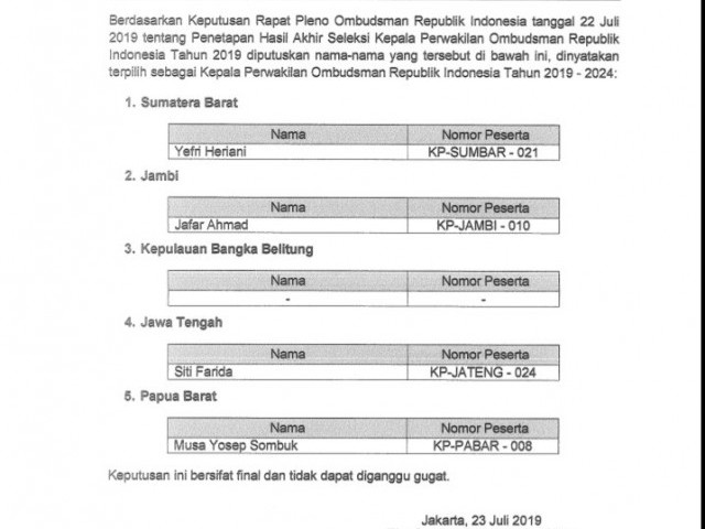 Dalam surat yang ditandatangani Tim seleksi Kepala Perwakilan Ombudsman RI pada 23 Juli 2019 itu menyebutkan Keputusan ini bersifat final dan tidak dapat diganggu gugat. (RED)
