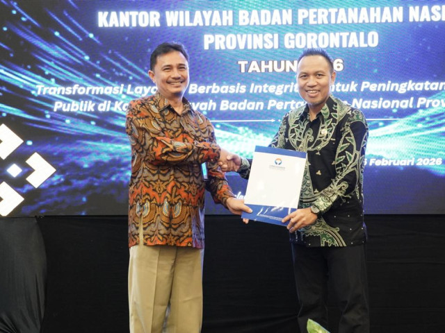 Gorontalo - Perwakilan Ombudsman RI Provinsi Gorontalo menyerahkan Hasil Penilaian Maladministrasi Penyelenggaraan Pelayanan Publik 2025 kepada Kantor Wilayah ATR/BPN Provinsi Gorontalo pada Rabu (4/2/2026) di Hotel Grand Q Gorontalo.