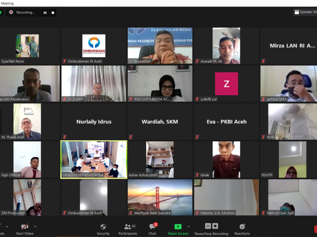 BANDA ACEH -- Ombudsman RI Perwakilan Aceh melakukan diskusi virtual tentang Pelayanan Kesehatan selama Coronavirus Disease 2019 (Covid-19) di Aceh, Rabu, 3 Juni 2020. Diskusi diikuti 89 orang partisipan itu dipandu Ilyas Isti selaku moderator dengan narasumber terdiri dari Kepala Ombudsman RI Perwakilan Aceh Dr. Taqwaddin Husin, Kepala Dinas Kesehatan Aceh dr. Hanif, Direktur RSUZA Banda Aceh Dr. Azharuddin, SpOT, Direktur RSUCM Aceh Utara drg. Nurhaida, M.PH dan Ketua Komisi V DPRA M. Rizal Falevi Kirani.