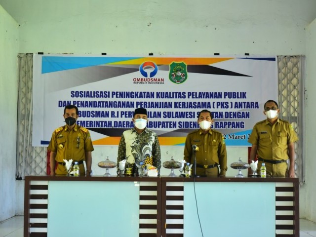 Penandatanganan dilakukan Wakil Bupati Sidrap, H. Mahmud Yusuf dan Kepala Ombudsman Sulsel, Subhan. Acara berlangsung di Baruga Kompleks SKPD Sidrap dirangkai Sosialisasi Peningkatan Kualitas Pelayanan Publik.