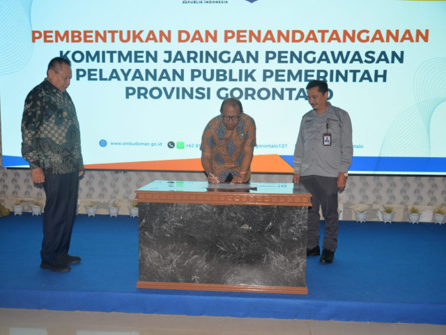 Kota Gorontalo, Kominfotik - Gubernur Gusnar Ismail memimpin penandatanganan komitmen jaringan pengawasan pelayanan publik bersama Ombudsman RI di Ruang Dulohupa, Kantor Gubernur Gorontalo, pada Jumat (20/2/2026) pagi guna memastikan birokrasi lebih responsif terhadap pengawasan masyarakat. Kegiatan ini mempertemukan pimpinan OPD dan pihak Ombudsman dalam sebuah Rapat Pimpinan (Rapim) untuk menjawab tantangan keterbukaan informasi di mana kinerja pemerintah kini terpantau secara langsung oleh publik.