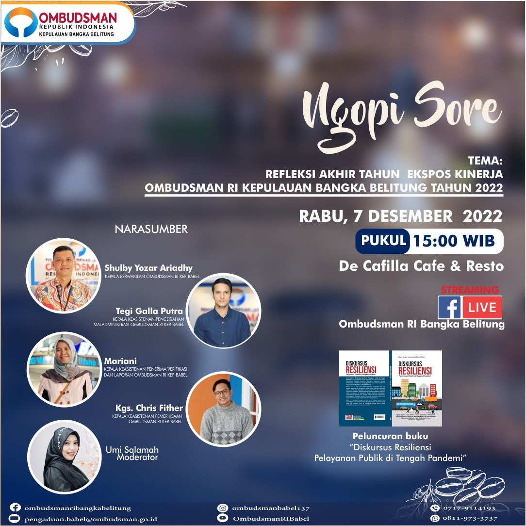 Ombudsman RI Kepulauan Bangka Belitung melalui kegiatan "Ngopi Sore: Refleksi Akhir Tahun Ekspos Kinerja Ombudsman RI Kepulauan Bangka Belitung Tahun 2022" tanggal 7 Desember 2022 di d'cafilla café, Jalan Ahmad Yani Dalam.