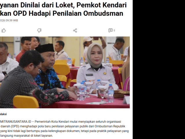 KENDARI,MITRANUSANTARA.ID Pemerintah Kota Kendari mulai menyiapkan seluruh organisasi pemerintah Daerah (OPD) menghadapi pola baru penilaian pelayanan publik dari Ombudsman perwakilan republik Indonesia yang kini tidak lagi bertumpuh pada kelengkapan dokumen,tetapi pada praktik pelayanan yang dirasakan langsung oleh masyarakat diloket layanan.langkah itu terlihat dalam workhsop pendampingan penilaiyan nmakdministrasi pelayanan publik yang digelar dilingkup pemkot kendari,Rabu(4/2/2026).kegiatan ini menghadirkan OPD ,Camat,lurah,puskesmas,hingga perwakilan sekolah untuk memahami indikator penilaiyan terbaru sesuai peraturan Ombudsman RI Nomor 61 tahun 2025