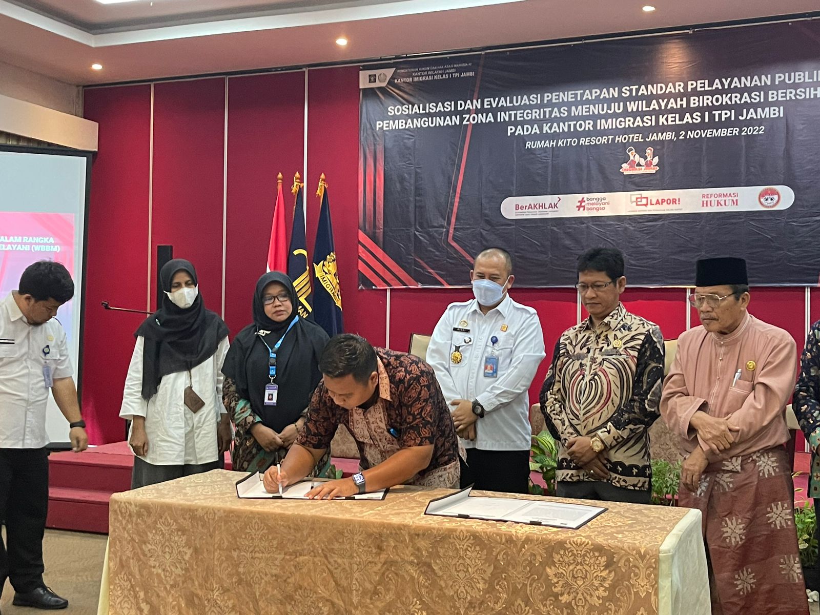 Jambi - Ombudsman RI Perwakilan Provinsi Jambi menghadiri kegiatan Sosialisasi dan Evaluasi Penetapan Standar Pelayanan pada Kantor Imigrasi Kelas I TPI Jambi di Hotel Rumah Kit00oada Rabu, 2 November 2022. Dalam kesempatan tersebut, Ombudsman menjadi saksi dalam penetapan standar pelayanan publik guna pembanunan Zona Integritas menuju Wilayah Birokrasi Bersih Melayani (WBBM).