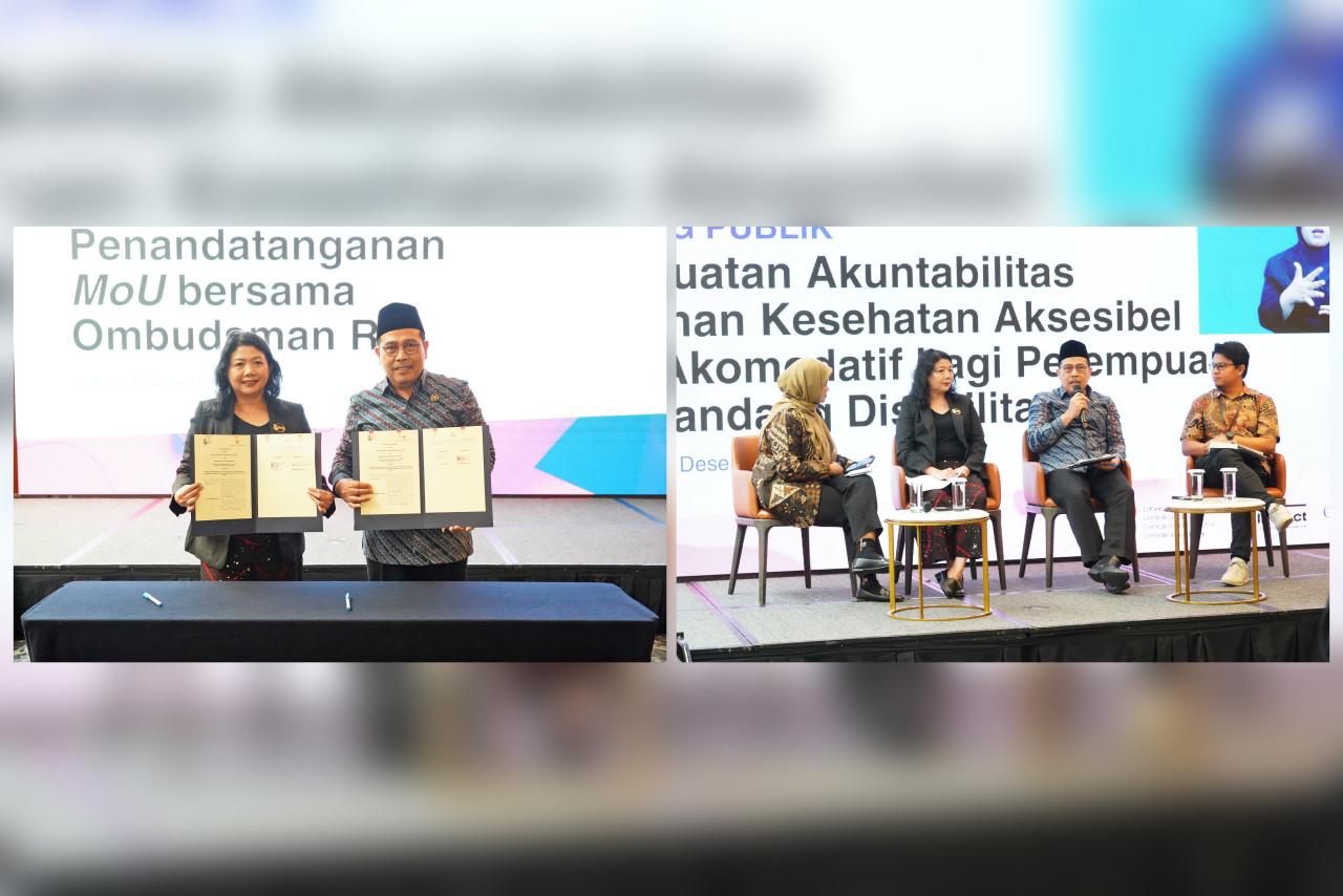 Ketua Ombudsman RI, Mokhammad Najih bersama Ketua Umum Himpunan Wanita Disabilitas Indonesia (HWDI) Revita Alvi menandatangani Nota Kesepahaman antara Ombudsman RI dengan HWDI yang dilanjutkan dengan Dialog Publik Penguatan Akuntabilitas Layanan Kesehatan Aksesibel dan Akomodatif bagi Perempuan Penyandang Disabilitas, pada Selasa (16/12/2025) di Hotel Aryaduta, Jakarta Pusat.
