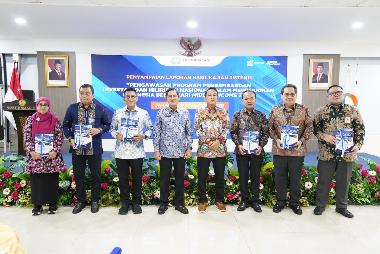Wakil Ketua Ombudsman RI, Bobby Hamzar Rafinus dan Anggota, Hery Susanto menyampaikan Hasil Kajian Sistematik "Pengawasan Program Pengembangan Investasi dan Hilirisasi Nasional Dalam Mewujudkan Indonesia Bebas Dari Middle Income Trap" kepada ketua Komisi XI DPR RI M. Misbakhun, Sesmenko Perekonomian Susiwijono Moegiarso dan Deputi Bidang Pengendalian dan Pelaksanaan Penanaman Modal BKPM, Edy Junaidi Harahap, Rabu (17/12/2025) di Gedung Ombudsman RI, Jakarta Selatan.